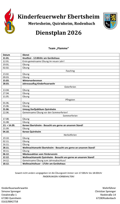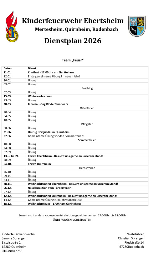 Dienstplan Kinderfeuerwehr 2026